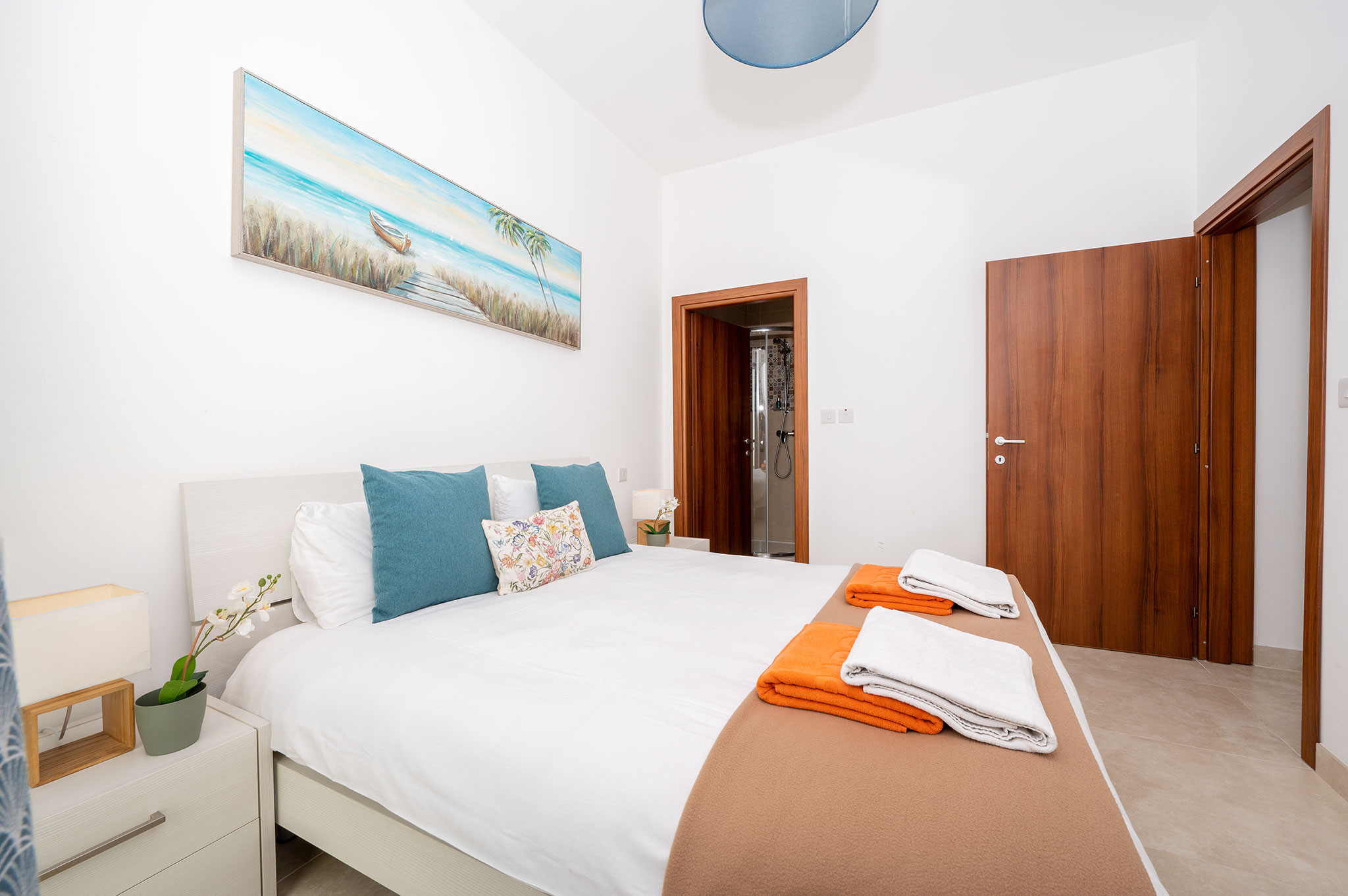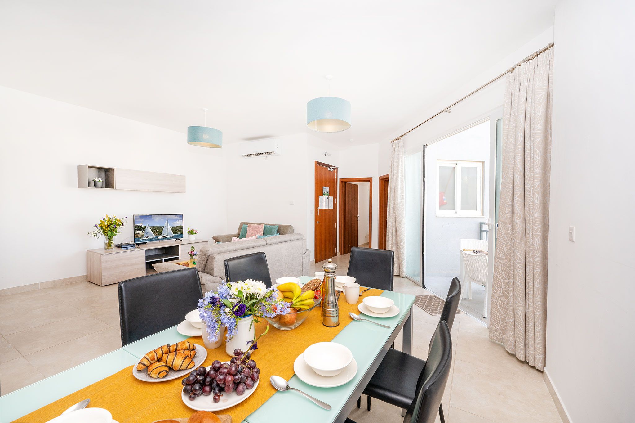 The newly built fully air-conditioned 2nd floor apartment D6 is artfully designed, offering a subdued luxury and restful experience. It consists of three bedrooms, one having ensuite shower facilities. Along with a main bathroom and shower, which connects to a combined and fully equipped kitchen/dining/living room having the added luxury of two good sized balconies.