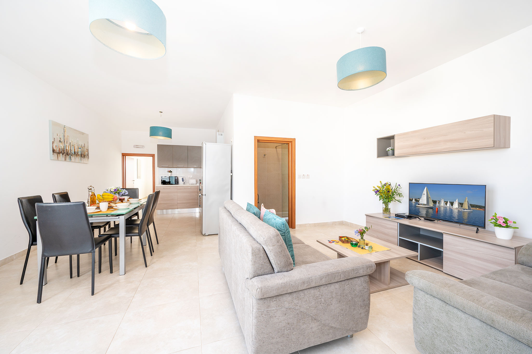 The modern kitchen is fully equipped with an impressive array of appliances, including a fridge, freezer, oven, microwave, dishwasher, coffee machine, toaster, kettle, and comprehensive kitchenware. An American-style layout ensures a sociable cooking experience. Guests can enjoy entertainment with a satellite TV supporting English and Italian languages.