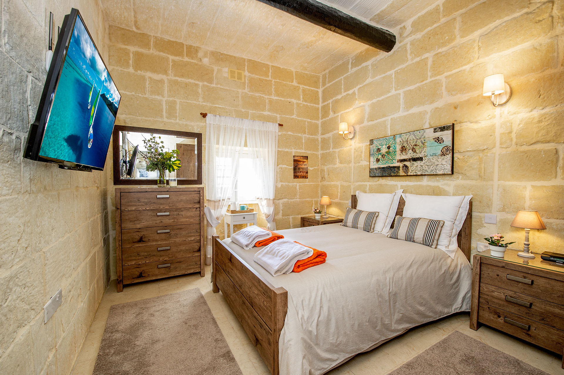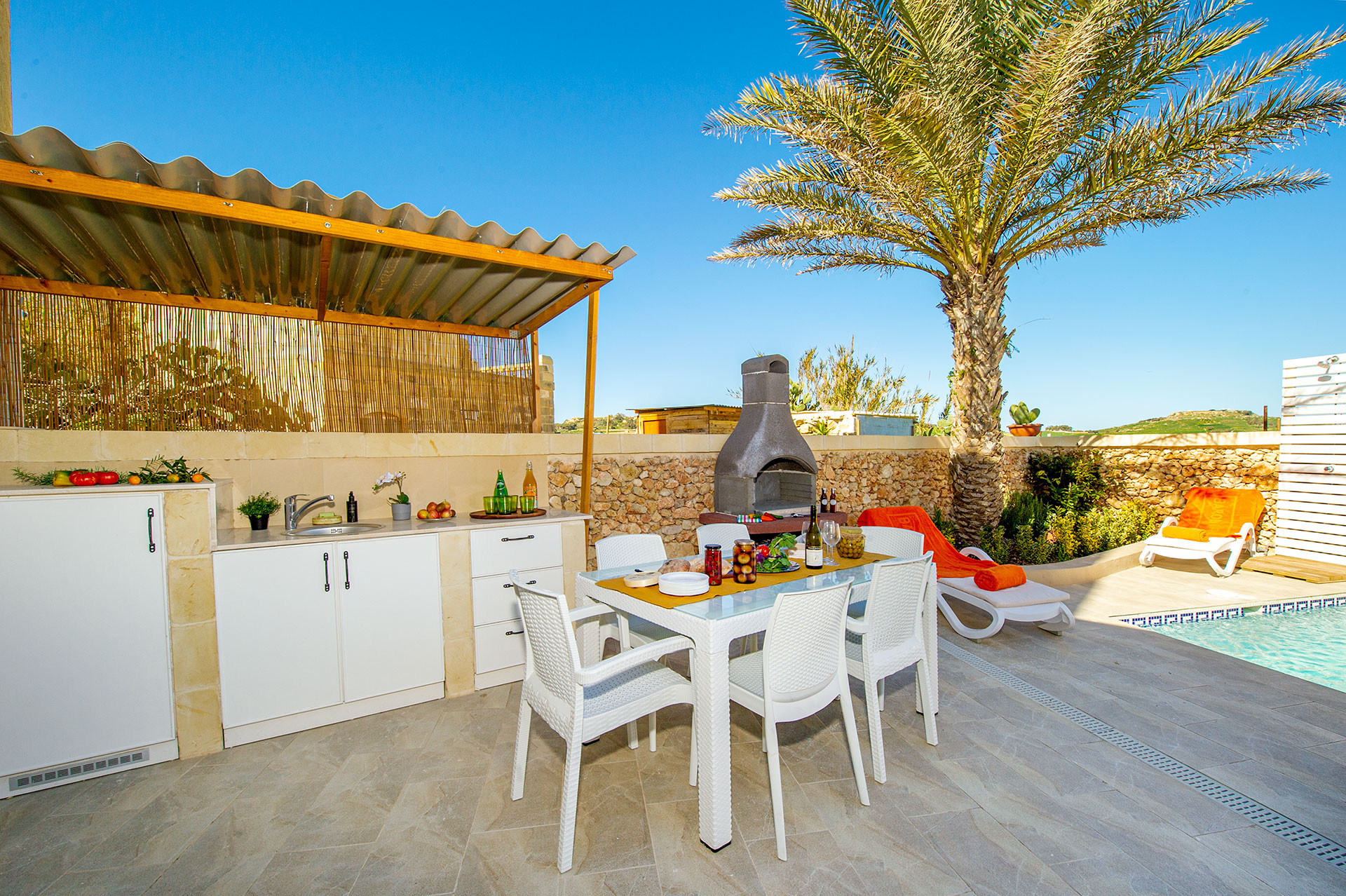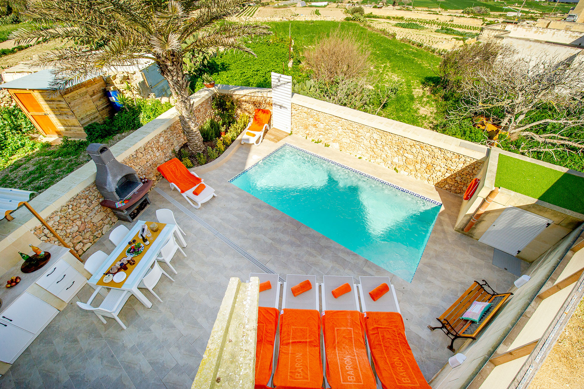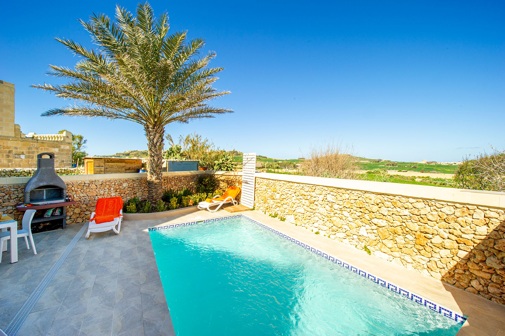 A highlight of this property is the private swimming pool measuring 3.5 x 3.5 metres, ideal for relaxing and enjoying sunny Maltese days. The interior features a cosy fireplace for cooler evenings, while air conditioning and a self-controlled heating and cooling system ensure year-round comfort via an electronic pay-as-you-go coin system (accepting €1 & €2 coins). Complimentary WiFi and a TV with English and Italian channels provide entertainment options.